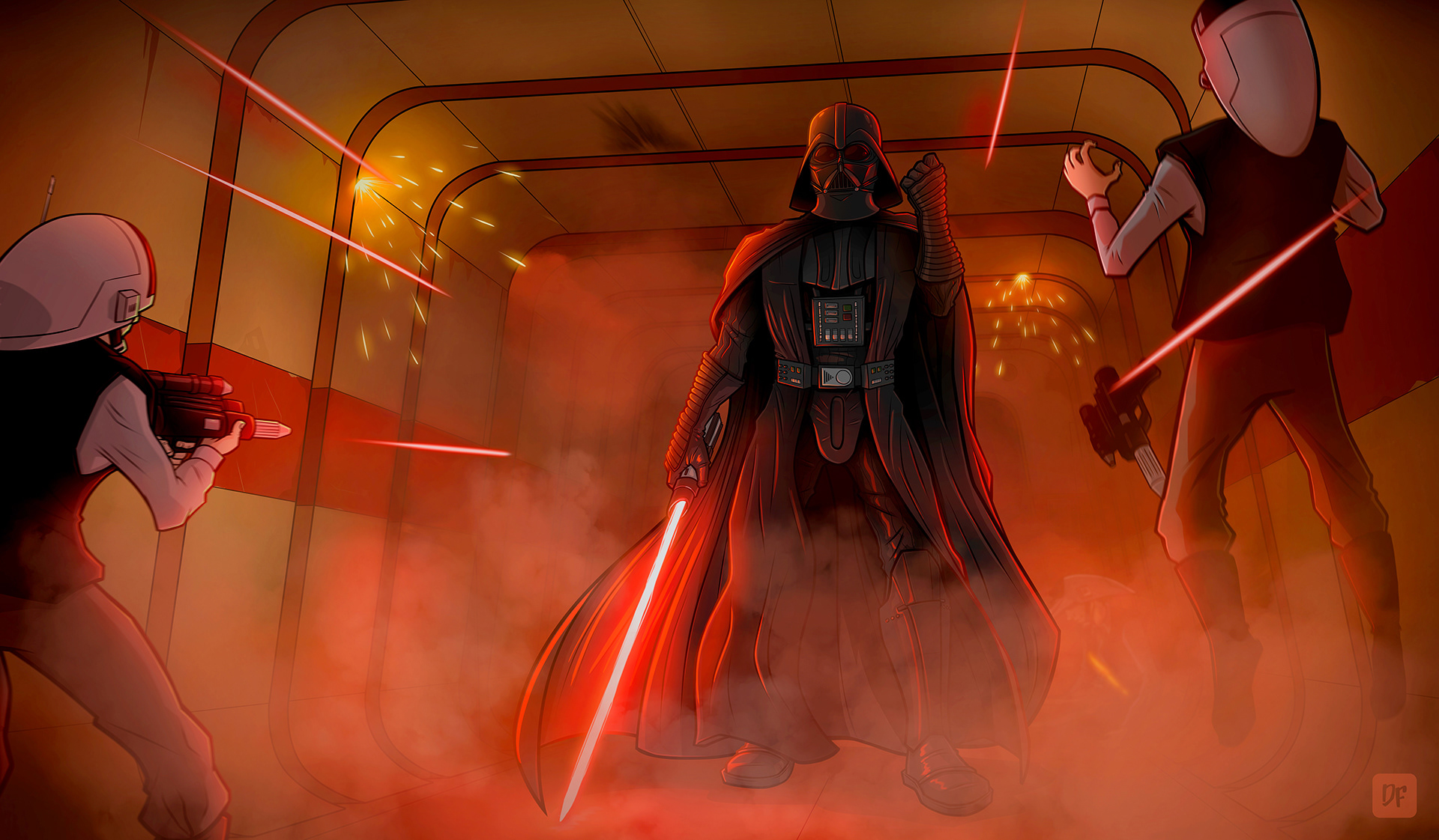 Famous end scene from the Rogue One movie, the Star Wars saga film. This piece inspired in Vader hunting down the rebels runaways that with the Death Star’s plans, prelude of the Episode IV, A New Hope. © Lucasfilm LTD.